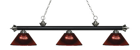 Elegant and traditional best describes this beautiful three light fixture. Finished in Matte Black + Brushed Nickel and paired with Burgundy Acrylic shades, this three light fixture would be equally at home in the game room, or anywhere else in the house needing a touch of timeless charm.