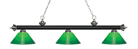 Elegant and traditional best describes this beautiful three light fixture. Finished in Matte Black + Brushed Nickel and paired with Green Cased glass shades, this three light fixture would be equally at home in the game room, or anywhere else in the house needing a touch of timeless charm.