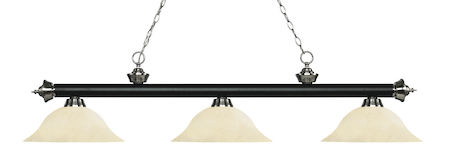 Elegant and traditional best describes this beautiful three light fixture. Finished in Matte Black + Brushed Nickel and paired with Golden Mottle glass shades, this three light fixture would be equally at home in the game room, or anywhere else in the house needing a touch of timeless charm.