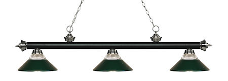 Elegant and traditional best describes this beautiful three light fixture. Finished in Matte Black + Brushed Nickel and paired with Clear Ribbed Glass and Dark Green shades, this three light fixture would be equally at home in the game room, or anywhere else in the house needing a touch of timeless charm.