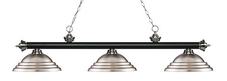 Elegant and traditional best describes this beautiful three light fixture. Finished in Matte Black + Brushed Nickel and paired with Stepped Brushed Nickel Metal shades, this three light fixture would be equally at home in the game room, or anywhere else in the house needing a touch of timeless charm.