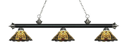Traditional charm defines this three light fixture. The bar is finished in Matte Black and Brushed Nickel and is paired beautifully with three multi colored tiffany shades for an inviting glow. This fixture would be equally at home in the game room, or anywhere else in your home needing a touch of timeless charm.