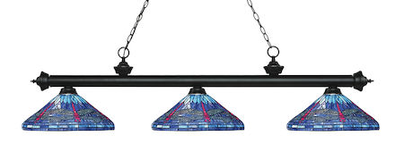 Traditional charm defines this three light fixture. The bar is finished in Matte Black and is paired beautifully with three multi colored tiffany shades for an inviting glow. This fixture would be equally at home in the game room, or anywhere else in your home needing a touch of timeless charm.