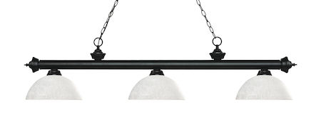 Elegant and traditional best describes this beautiful three light fixture. Finished in Matte Black and paired with Dome White Linen glass shades, this three light fixture would be equally at home in the game room, or anywhere else in the house needing a touch of timeless charm.