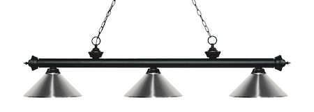 Elegant and traditional best describes this beautiful three light fixture. Finished in Matte Black and paired with Chrome Metal shades, this three light fixture would be equally at home in the game room, or anywhere else in the house needing a touch of timeless charm.