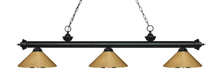 Elegant and traditional best describes this beautiful three light fixture. Finished in Matte Black and paired with Polished Brass Metal shades, this three light fixture would be equally at home in the game room, or anywhere else in the house needing a touch of timeless charm.