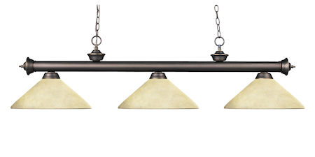 Elegant and traditional best describes this beautiful three light fixture. Finished in old bronze and paired with angle golden mottle shades, this three light fixture would be equally at home in the game room, or anywhere else in the house needing a touch of timeless charm. 72 inches of chain per side is included to ensure a perfect hanging height.
