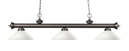 Finished in olde bronze this three light bar fixture uses angle matte opal glass shades to create a contemporary look with a timeless quality to it. This fixture would be perfect for the game room, or any other room of the house where a touch of under stated sophistication is needed.