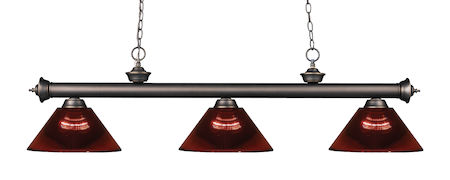 Finished in olde bronze this three light bar fixture uses acrylic burgundy shades to create a contemporary look with a timeless quality to it. This fixture would be perfect for the game room, or any other room of the house where a touch of under stated sophistication is needed.