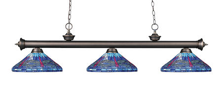 Traditional charm defines this three light fixture. The bar is finished in olde bronze, and is paired beautifully with three multi colored tiffany shades for an inviting glow.