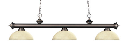 Elegant and traditional best describes this beautiful three light fixture. Finished in olde bronze and paired with dome golden mottle glass shades, this three light fixture would be equally at home in the game room, or anywhere else in the house needing a touch of timeless charm.
