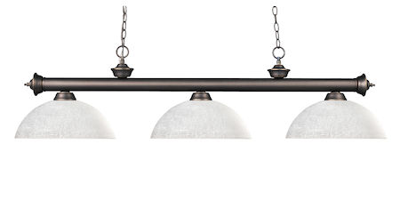 Elegant and traditional best describes this beautiful three light fixture. Finished in old bronze and paired with dome white linen shades, this three light fixture would be equally at home in the game room, or anywhere else in the house needing a touch of timeless charm. 72 inches of chain per side is included to ensure a perfect hanging height.