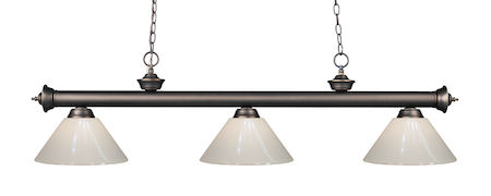 Finished in olde bronze this three light bar fixture uses plastic white shades to create a contemporary look with a timeless quality to it. This fixture would be perfect for the game room, or any other room of the house where a touch of under stated sophistication is needed.