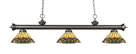 Traditional charm defines this three light fixture. The bar is finished in olde bronze, and is paired beautifully with three multi colored tiffany shades for an inviting glow.
