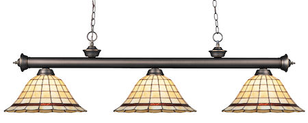 Elegant and traditional best describes this beautiful three light fixture. Finished in old bronze and paired with tiffany glass shades, this three light fixture would be equally at home in the game room, or anywhere else in the house needing a touch of timeless charm. 72 inches of chain per side is included to ensure a perfect hanging height.