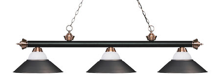 Finished in Matte Black and Antique Copper this three light bar fixture uses white mottle glass and olde bronze metal to create a contemporary look with a timeless quality to it. This fixture would be perfect for the game room, or any other room of the house where a touch of under stated sophistication is needed.