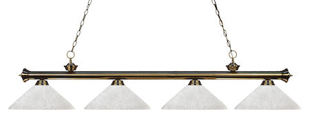 Finished in antique brass this four light bar fixture uses angle white linen glass shades to create a contemporary look with a timeless quality to it. This fixture would be perfect for the game room, or any other room of the house where a touch of under stated sophistication is needed.