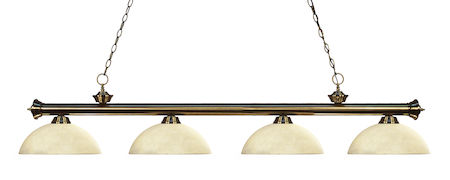 Elegant and traditional best describes this beautiful four light fixture. Finished in antique brass and paired with dome golden mottle glass shades, this four light fixture would be equally at home in the game room, or anywhere else in the house needing a touch of timeless charm.