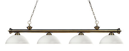 Elegant and traditional best describes this beautiful four light fixture. Finished in antique brass and paired with dome matte opal glass shades, this four light fixture would be equally at home in the game room, or anywhere else in the house needing a touch of timeless charm.