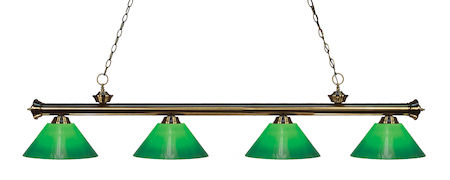 Elegant and traditional best describes this beautiful four light fixture. Finished in antique brass and paired with green cased glass shades, this four light fixture would be equally at home in the game room, or anywhere else in the house needing a touch of timeless charm.