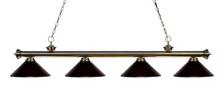 Elegant and traditional best describes this beautiful four light fixture. Finished in antique brass and paired with metal bronze shades, this four light fixture would be equally at home in the game room, or anywhere else in the house needing a touch of timeless charm