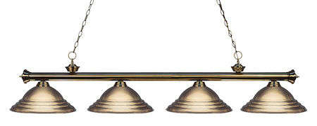 Elegant and traditional best describes this beautiful four light fixture. Finished in antique brass and paired with metal stepped antique brass shades, this four light fixture would be equally at home in the game room, or anywhere else in the house needing a touch of timeless charm