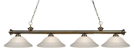 The slim styling of this four light fixture creates a classic yet modern statement. Finished in antique brass, this four light fixture uses white swirl glass shades to compliment its classic look.