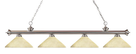 Finished in brushed nickel this four light bar fixture uses angle golden mottle glass shades to create a contemporary look with a timeless quality to it. This fixture would be perfect for the game room, or any other room of the house where a touch of under stated sophistication is needed.