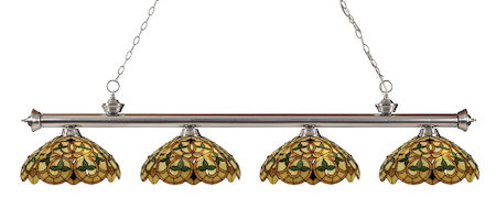Traditional charm defines this four light fixture. The bar is finished in brushed nickel, and is paired beautifully with four multi colored tiffany shades, for an inviting glow.