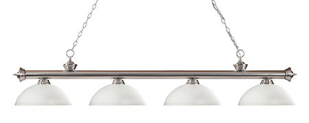 Elegant and traditional best describes this beautiful four light fixture. Finished in brushed nickel and paired with dome matte opal glass shades, this four light fixture would be equally at home in the game room, or anywhere else in the house needing a touch of timeless charm.