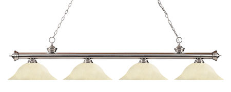 The slim styling of this four light fixture creates a classic yet modern statement. Finished in brushed nickel, this four light fixture uses golden mottle glass shades to compliment its classic look