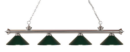 Elegant and traditional best describes this beautiful four light fixture. Finished in brushed nickel and paired with metal dark green shades, this four light fixture would be equally at home in the game room, or anywhere else in the house needing a touch of timeless charm
