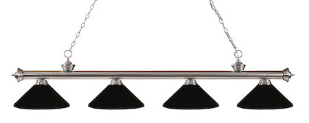 Elegant and traditional best describes this beautiful four light fixture. Finished in brushed nickel and paired with metal matte black shades, this four light fixture would be equally at home in the game room, or anywhere else in the house needing a touch of timeless charm
