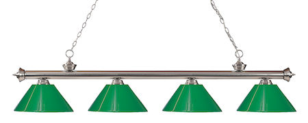 Finished in brushed nickel this four light bar fixture uses plastic green shades to create a contemporary look with a timeless quality to it. This fixture would be perfect for the game room, or any other room of the house where a touch of under stated sophistication is needed.