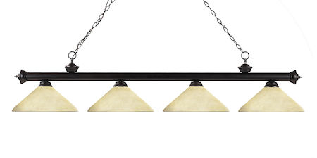 Finished in bronze, this four light bar fixture uses angle golden mottle glass shades to create a contemporary look with a timeless quality to it. This fixture would be perfect for the game room, or any other room of the house where a touch of under stated sophistication is needed.