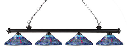 Traditional charm defines this four light fixture. The bar is finished in bronze, and is paired beautifully with four multi colored tiffany shades, for an inviting glow.