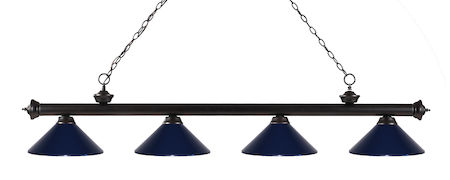 Elegant and traditional best describes this beautiful four light fixture. Finished in bronze and paired with metal navy blue shades, this four light fixture would be equally at home in the game room, or anywhere else in the house needing a touch of timeless charm