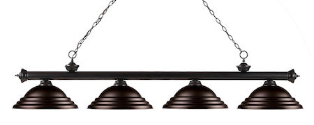 Elegant and traditional best describes this beautiful four light fixture. Finished in bronze and paired with stepped bronze metal shades, this four light fixture would be equally at home in the game room, or anywhere else in the house needing a touch of timeless charm