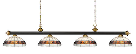 Traditional charm defines this four light fixture. The bar is finished in Bronze & Satin Gold, and is paired beautifully with four multi colored tiffany shades, for an inviting glow.