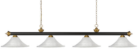 Elegant and traditional best describes this beautiful four light fixture. Finished in Bronze & Satin Gold and paired with fluted white mottle glass shades, this four light fixture would be equally at home in the game room, or anywhere else in the house needing a touch of timeless charm.
