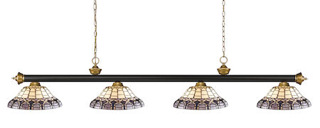 Traditional charm defines this four light fixture. The bar is finished in Bronze & Satin Gold, and is paired beautifully with four multi colored tiffany shades for an inviting glow.