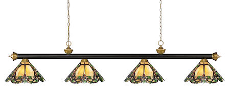 Traditional charm defines this four light fixture. The bar is finished in Bronze & Satin Gold, and is paired beautifully with four multi colored tiffany shades, for an inviting glow.