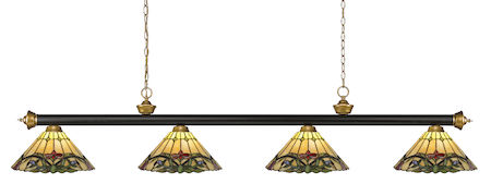Traditional charm defines this four light fixture. The bar is finished in Bronze & Satin Gold, and is paired beautifully with four multi colored tiffany shades, for an inviting glow.