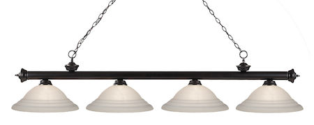 The slim styling of this four light fixture creates a classic yet modern statement. Finished in bronze, this four light fixture uses white swirl glass shades to compliment its classic look.