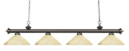 Finished in olde bronze this four light bar fixture uses angle golden mottle glass shades to create a contemporary look with a timeless quality to it. This fixture would be perfect for the game room, or any other room of the house where a touch of under stated sophistication is needed.