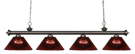 Finished in olde bronze this four light bar fixture uses acrylic burgundy shades to create a contemporary look with a timeless quality to it. This fixture would be perfect for the game room, or any other room of the house where a touch of under stated sophistication is needed.