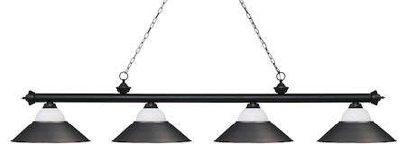 Finished in Matte Black, this four light bar fixture uses white mottle glass and olde bronze metal shades to create a contemporary look with a timeless quality to it. This fixture would be perfect for the game room, or any other room of the house where a touch of under stated sophistication is needed.