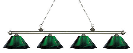 Finished in antique silver this four light bar fixture uses green acrylic shades to create a contemporary look with a timeless quality to it. This fixture would be perfect for the game room, or any other room of the house where a touch of under stated sophistication is needed.