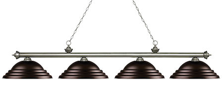 Finished in antique silver this four light bar fixture uses stepped bronze metal shades to create a contemporary look with a timeless quality to it. This fixture would be perfect for the game room, or any other room of the house where a touch of under stated sophistication is needed.