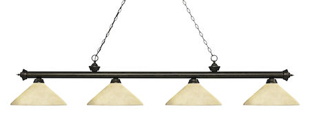 Finished in golden bronze this four light bar fixture uses angle golden mottle glass shades to create a contemporary look with a timeless quality to it. This fixture would be perfect for the game room, or any other room of the house where a touch of under stated sophistication is needed.